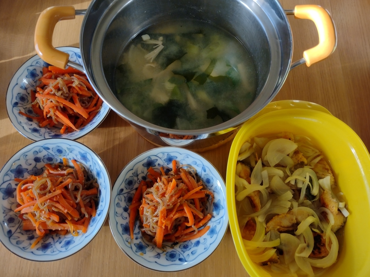 今日の夕食、明日の昼食分です。きんぴらと味噌汁は多めです。