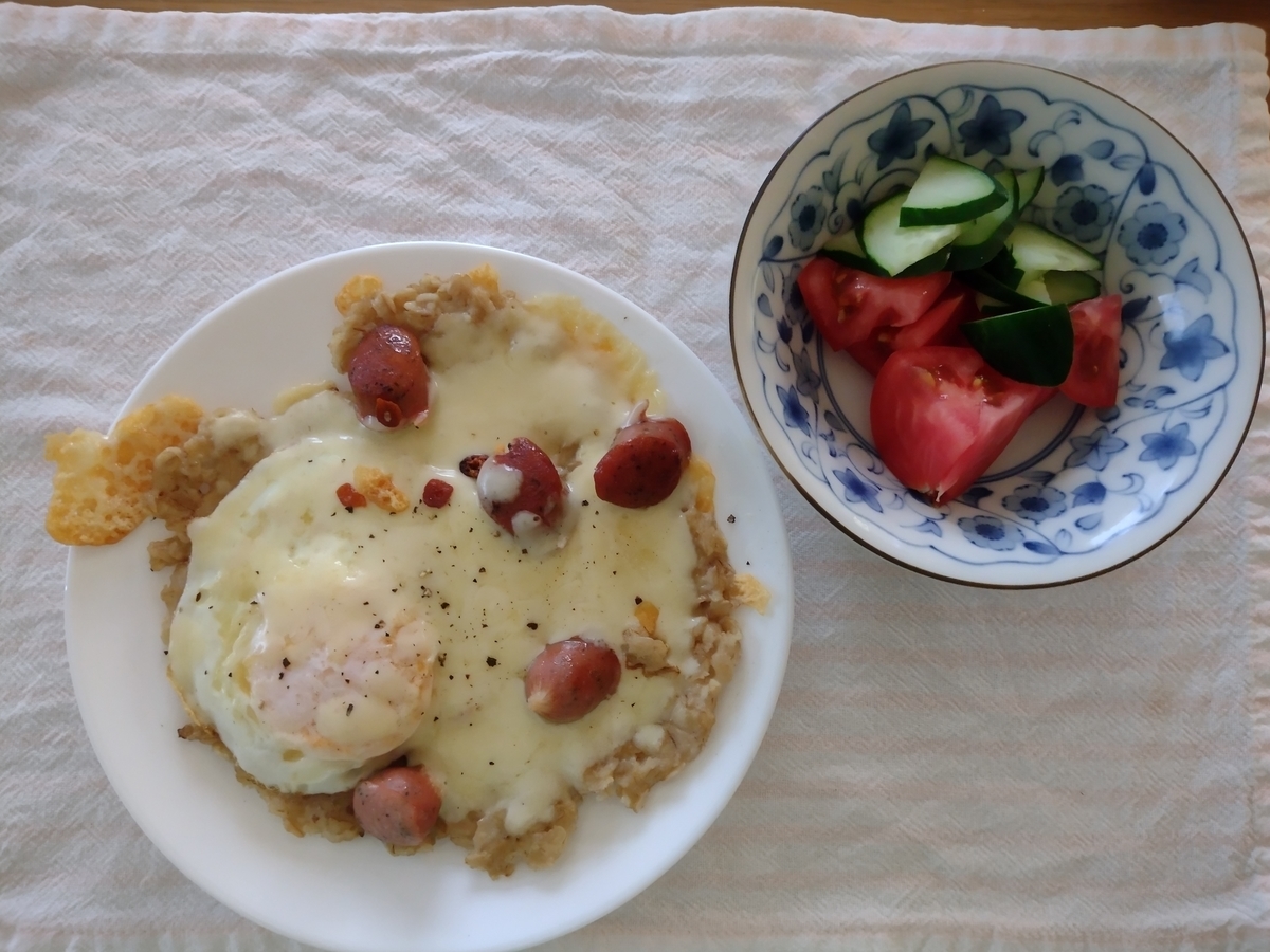 - 焼いたオートミールの上に、目玉焼きやソーセージを乗せ、チーズをかけ、蓋をする。