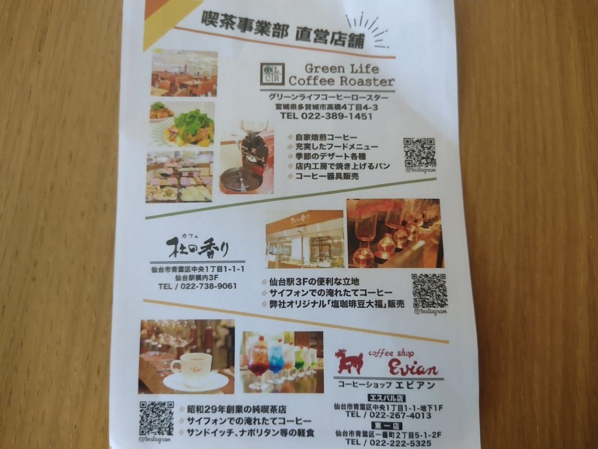 仙台駅3階にある「カフェ杜の香り」のコーヒー粉なのですが、仙台駅の通路で試飲と物販してるところで出会いました。